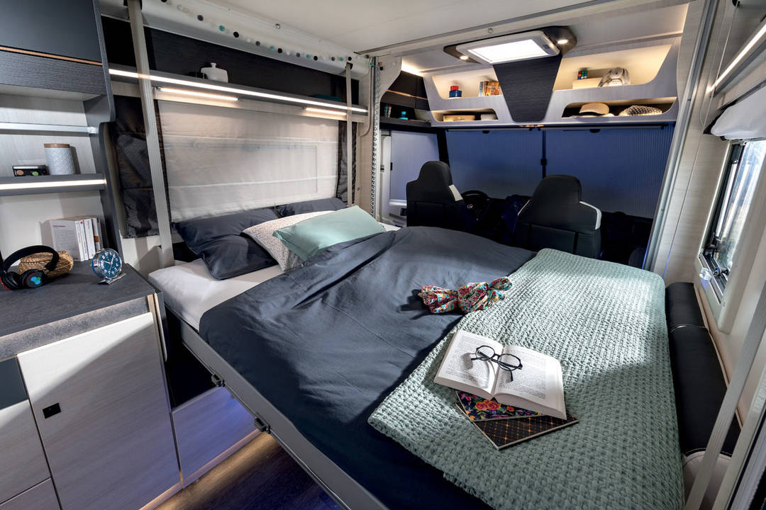 Loftsängen frigör utrymme i husbilen under dagen, vilket gör den perfekt för alla som behöver gott om plats för att röra sig och koppla av. På sätt blir det mer plats för förvaringsutrymmen eller andra delar av husbilen (badrum, kök osv.)